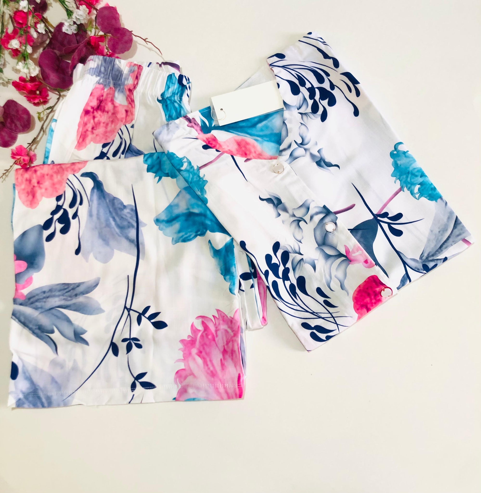 – Imprimé floral aux tons doux (bleu, rose et blanc)