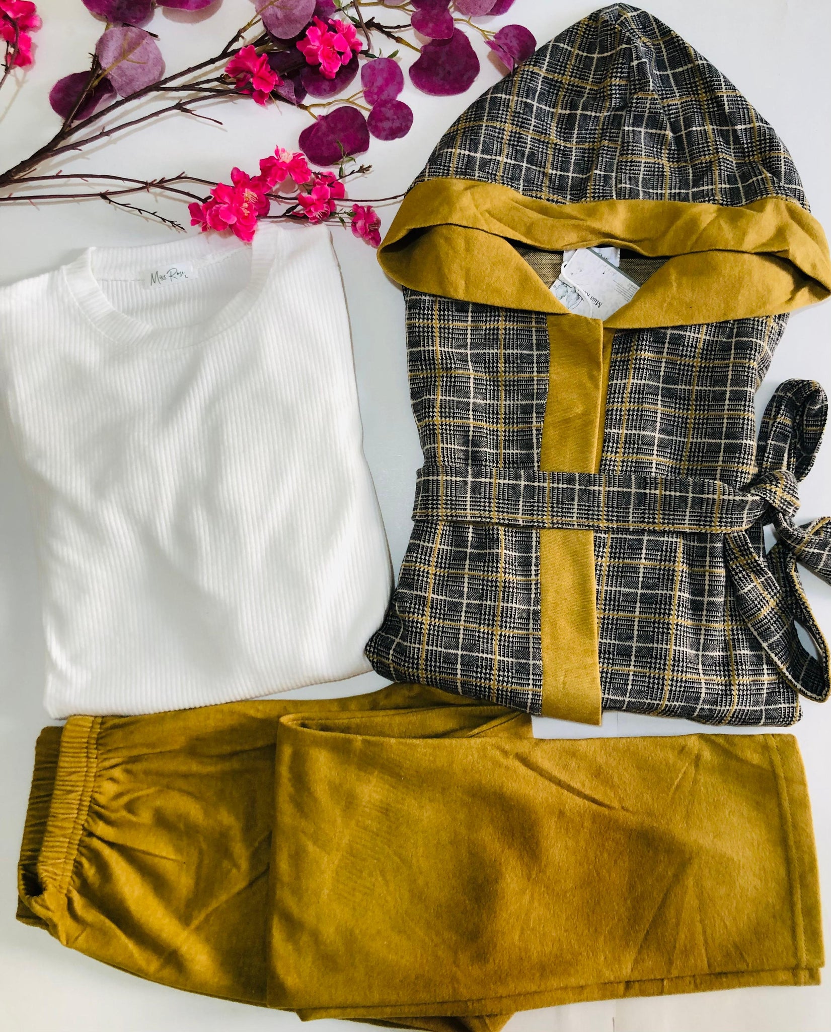 Composé d’un haut à manches longues, d’un pantalon fluide et d’une veste à ceinture, cet ensemble est parfait pour les soirées d’automne et d’hiver 🍂❄️