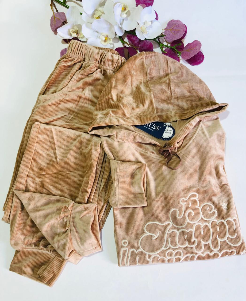 Ce pyjama en velours est une parfaite combinaison de confort et de style pour vos moments de détente à la maison. Disponible en trois couleurs élégantes : rouge brique, gris perle et beige doux, il est conçu avec une texture douce et luxueuse qui vous enveloppera de chaleur. Le haut à capuche ajoute une touche moderne et décontractée, tandis que le pantalon assorti est coupé pour offrir une coupe ajustée mais confortable. Les détails brodés sur le haut, avec l'inscription "Be Happy in Pyjama", apportent une touche ludique. Disponible dans les tailles M à XXL, ce modèle convient à différentes morphologies, garantissant à chacun une sensation de bien-être. Idéal pour les soirées cocooning ou les journées à la maison.