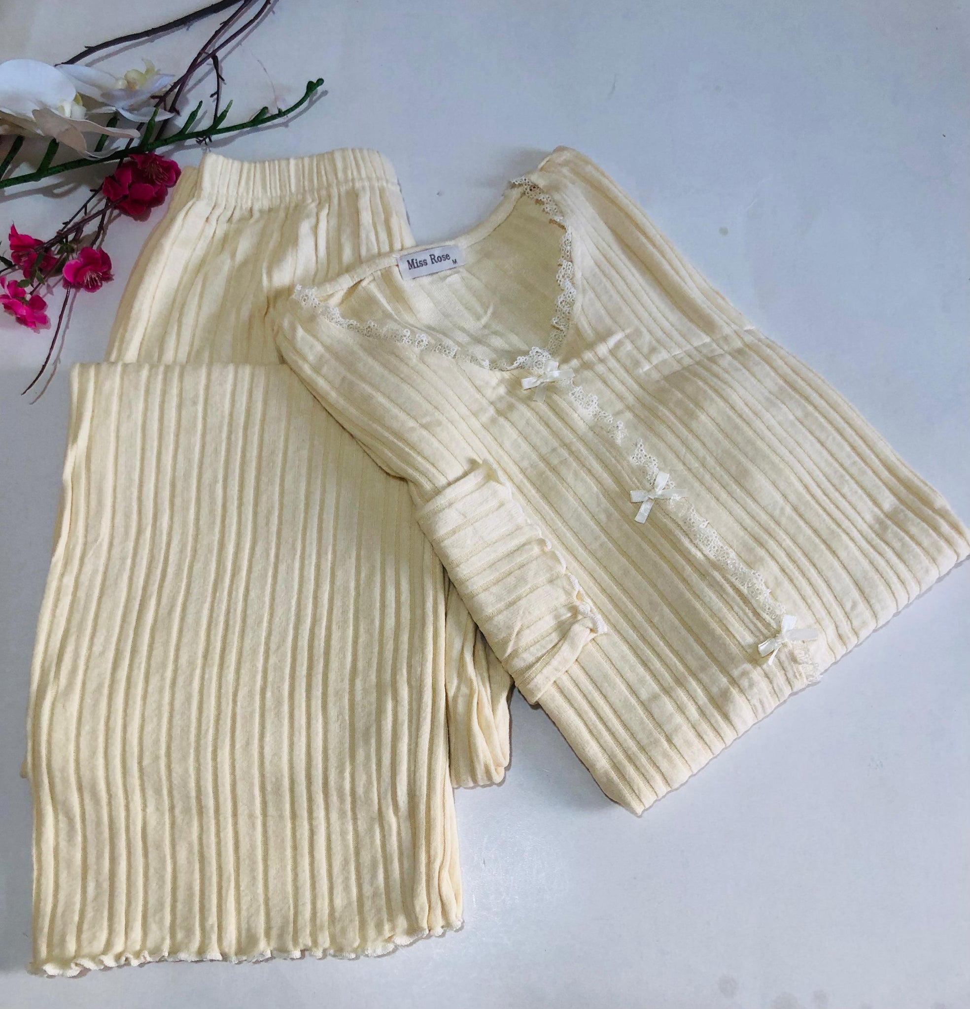 Le haut boutonné est sublimé par des détails en dentelle raffinés au col et sur la poche, accompagné d’un petit nœud délicat pour une touche de féminité.