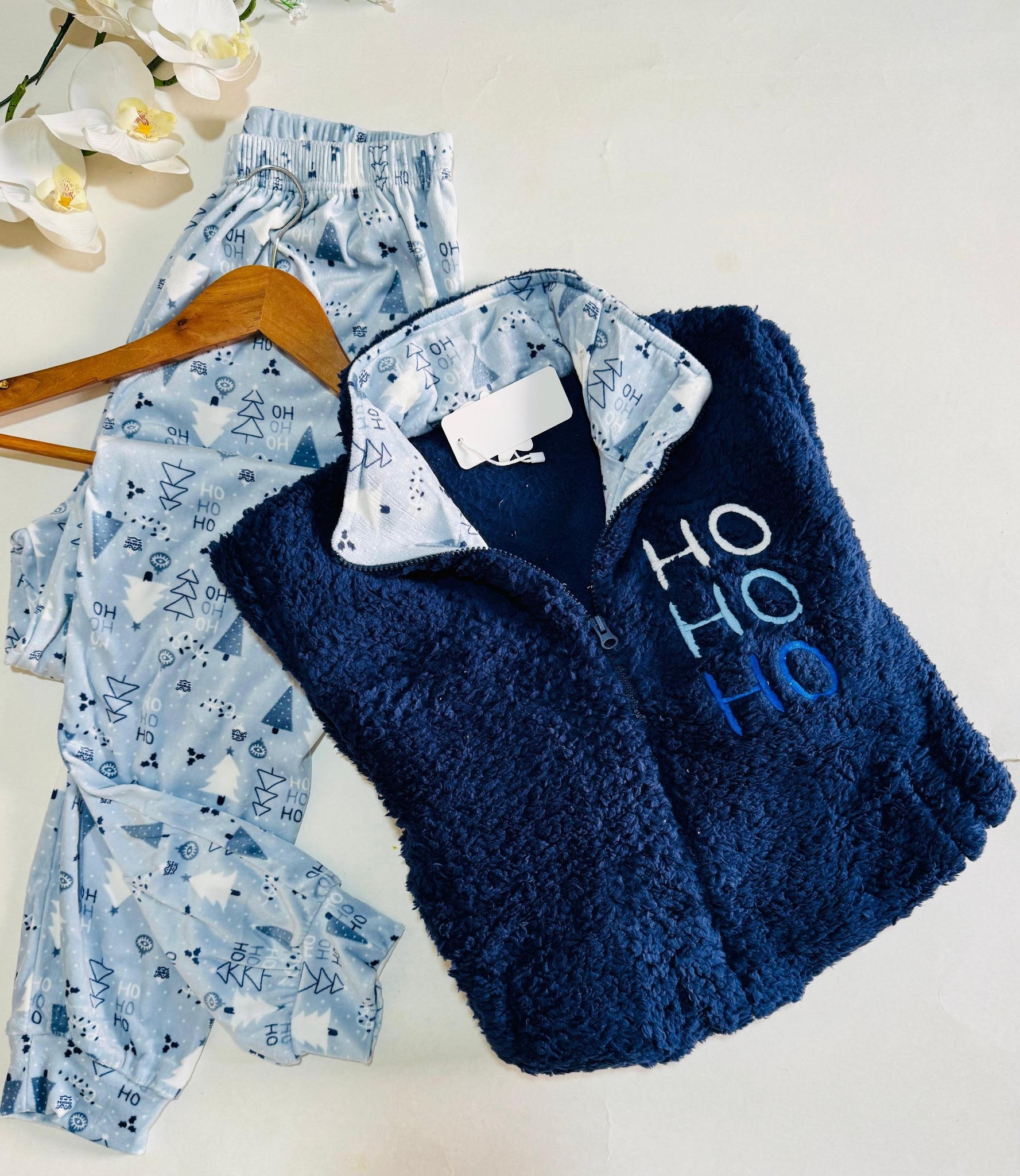 Ce pyjama polaire deux pièces se compose d'un haut bleu marine ultra-doux avec une broderie festive "HO HO HO" et d'un pantalon assorti en flanelle imprimé avec des motifs hivernaux de sapins de Noël. Un ensemble parfait pour rester au chaud et à l'aise tout en gardant un style chic et décontracté.